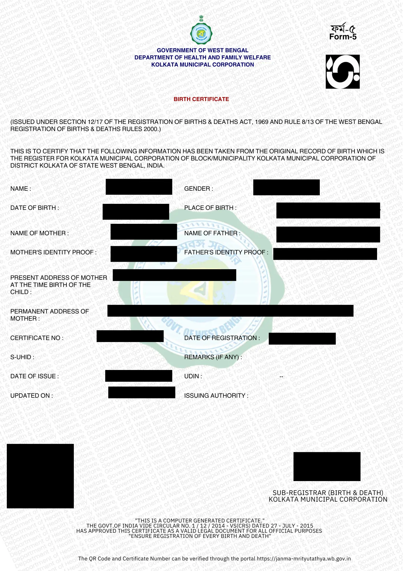 NRIWAY applies for a birth record search at the Municipal Corporation. If the record is found, a Birth Certificate (Form 5) is issued. If no record is available, a Non-Availability of Birth Certificate (NABC - Form 10) is issued. The certificate is signed by the Sub-Registrar of Birth & Death or the Health Department.