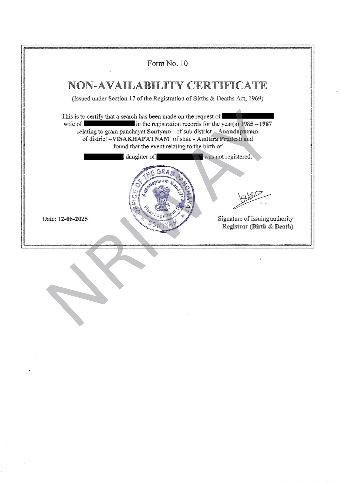 I never imagined getting a Non-Availability Birth Certificate from Visakhapatnam could be this smooth. NRIWAY handled everything efficiently without needing me to visit India.